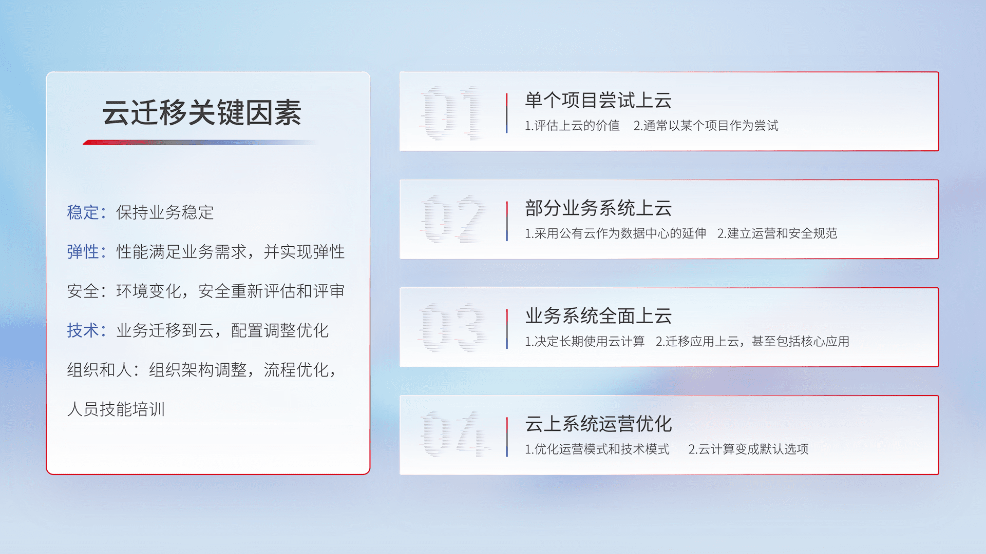 结合实际业务,,从规划设计、、、、云平台选型、、、、云原生改造、、、、数据迁移、、、集成交付,,迁移全过程为客户识别最佳上云路径,,,做好风险识别管理,,,设计网络架构、、、身份权限、、、、安全审计合规、、、、操作审计、、日志审计、、、、监控告警策略、、、多站点容灾设计等,,对云上基础设施进行整体规划,,,,提升IT治理水平,,,以满足弹性、、高可用、、、高性能的需求。。。。