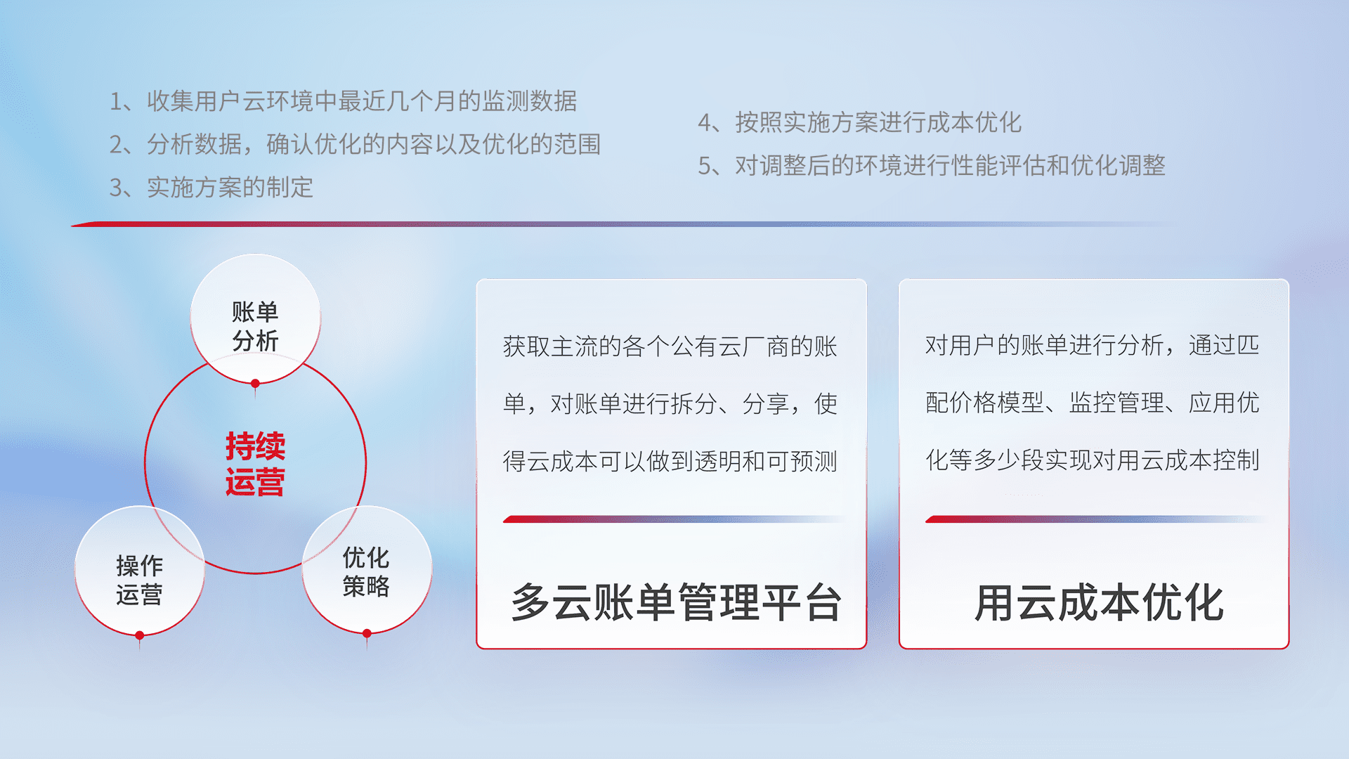 通过多云纳管,,以统一的资源数据模型把客户的云资源进行抽象和封装,,,,进而实现对多云资源的统一操作,,,保障云资源管理的可靠性、、稳定性与可用性。。。。量身定制化运维内容,,,配置、、开发运维、、、、补丁管理、、、、备份、、、、监控、、认证和访问管理、、审计和日常巡检等,,,,保障在用云过程中的可靠度,,稳定度以及高可用率。。。